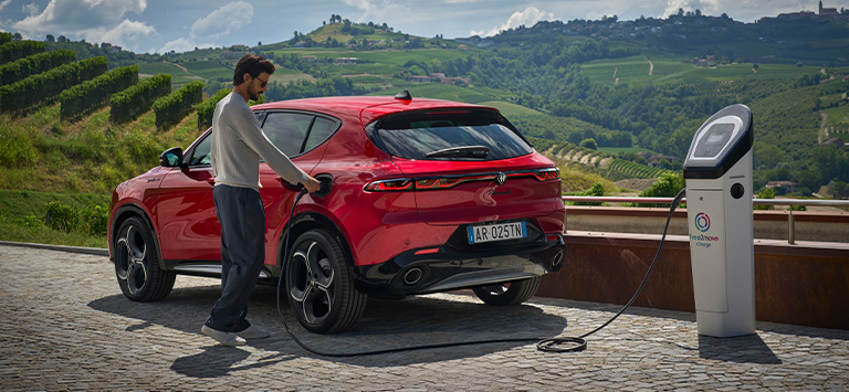 - PHEV (Plug-in Hybrid Electric Vehicle) – Hier arbeitet der Verbrennungsmotor mit einem extern aufladbaren Elektromotor zusammen. Die Batterie lässt sich über eine Ladeschnittstelle und beim Bremsen aufladen. Der Alfa Romeo Tonale Ibrida Plug-in Q4 bietet eine elektrische Reichweite von bis zu 61 km im kombinierten WLTP-Zyklus und bis zu 600 km Gesamtreichweite.