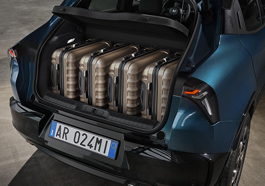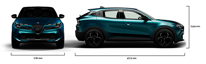 Die Abmessungen des Alfa Romeo Junior Ibrida Q4 verkörpern das ideale sportlich-kompakte Fahrzeug: 4.173 mm lang, 1.544 mm hoch und 1.781 mm breit, ohne Außenspiegel. Der Kofferraum bietet ein großzügiges Ladevolumen von bis zu 340 Litern und bietet ausreichend Platz für Gepäck und Alltagsgegenstände. Damit ist der Alfa Romeo Junior Ibrida Q4 sowohl für den Stadtverkehr als auch für längere Reisen vielseitig und praktisch.