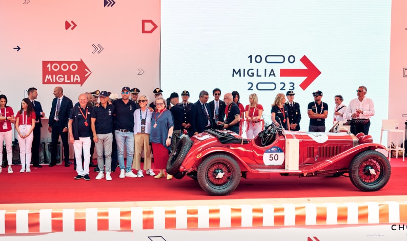 Zugelassen waren bei der 41. Mille Miglia Storico wie gewohnt ausschließlich Fahrzeuge der Typen, die an dem originalen Straßenrennen zwischen 1927 und 1957 teilnahmen. Der Alfa Romeo 2000 Sportiva von Tom Wlaschiha und Nina Weizenecker wurde 1954 insgesamt nur vier Mal gebaut, zwei Coupés und zwei Spider. Das rund 138 PS starke Mille-Miglia-Fahrzeug der beiden Deutschen stammt aus der Sammlung von Stellantis Heritage und ist normalerweise im Werksmuseum von Alfa Romeo in Arese bei Mailand zu bewundern.